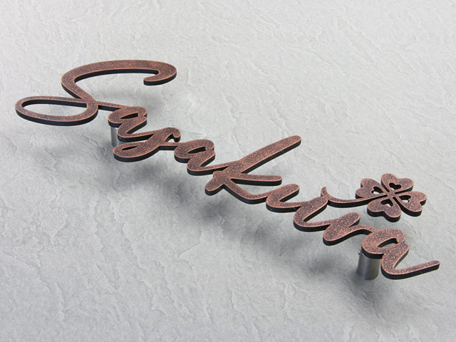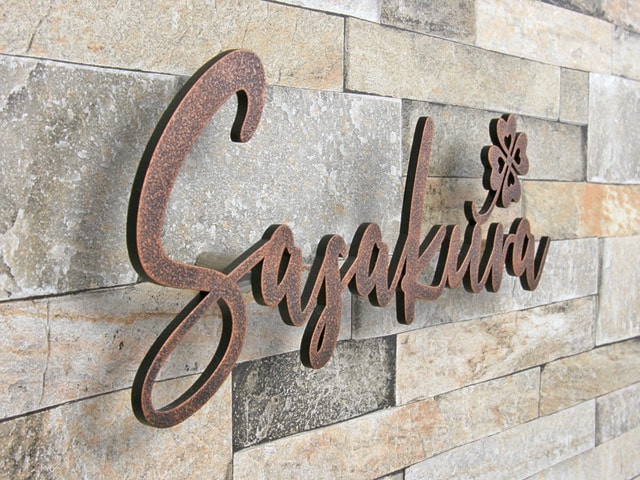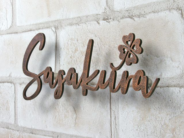 表札 KMIR-DB-N14(アイアン調表札/筆記体+クローバーデザイン)KMアイアン