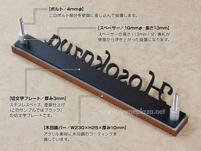 お取り付けの際は、上記の「ボルト」部分を壁面に差し込みますので、「スペーサー」部分の高さ(13mm)分、表札が壁面から浮き上がった設置となります。