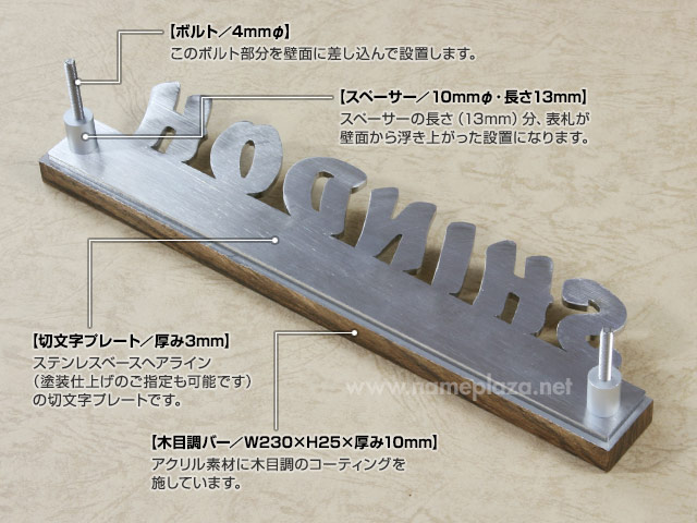 お取り付けの際は、上記の「ボルト」部分を壁面に差し込みますので、「スペーサー」部分の高さ(13mm)分、表札が壁面から浮き上がった設置となります。