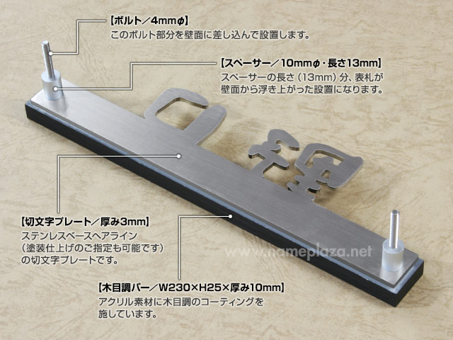 お取り付けの際は、上記の「ボルト」部分を壁面に差し込みますので、「スペーサー」部分の高さ(13mm)分、表札が壁面から浮き上がった設置となります。