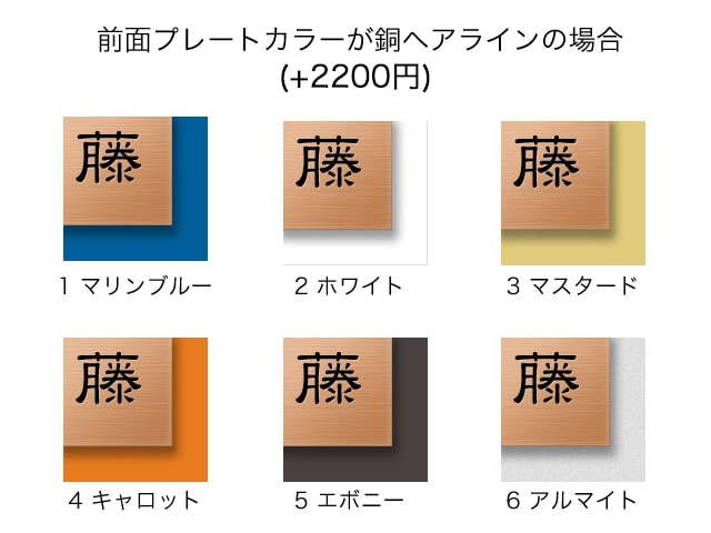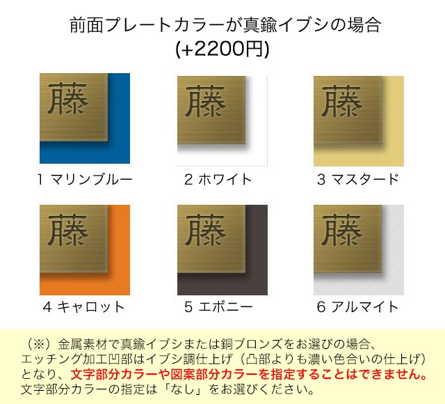 凹部はイブシ調仕上げ(凸部よりも濃い色合い)となり、文字部分カラーや図案部分カラーを指定することはできません。