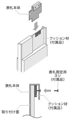 始めに、ウィルモダン表札設置面の裏側に適切な厚みのクッション材 (付属品)(※注)をお貼り下さい。次に、表札本体を設置面にはめ込み、裏側から固定用ネジ(付属品)で 表札を固定すれば設置完了です。