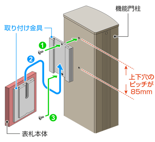 【 表札の上下1ヶ所ずつ(計2ヶ所)でビス留め・穴ピッチ85mmの門柱に対応します 】