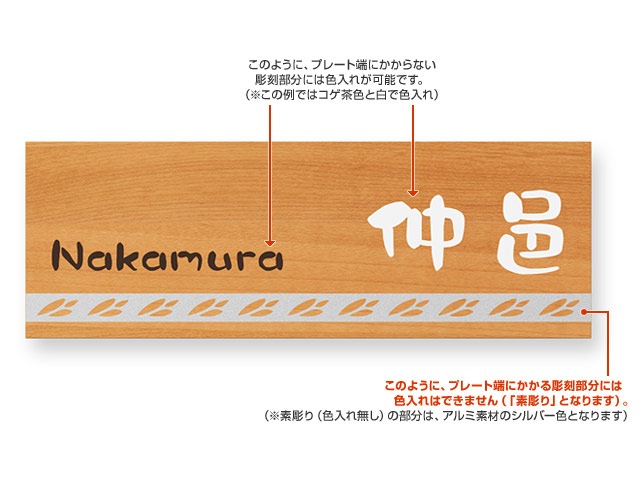 (※「素彫り」とは、サンドブラスト加工のみを施して着色をしない彫刻加工仕上げです。「素彫り」の部分は、ベース金属のアルミ素材の色(明るいシルバー)になります。)