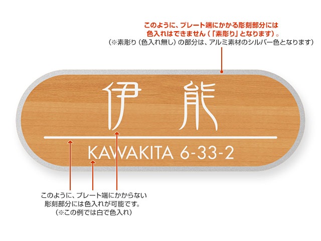 (※「素彫り」とは、サンドブラスト加工のみを施して着色をしない彫刻加工仕上げです。「素彫り」の部分は、ベース金属のアルミ素材の色(明るいシルバー)になります。)