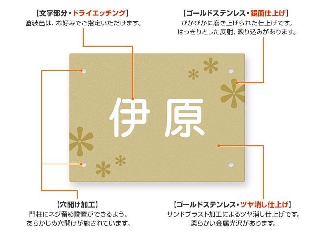 表札 門柱用 SIHL8-FBDG-N57 (HL8型門柱用/ゴールドステンレス) 4穴タイプ W150×H110mm