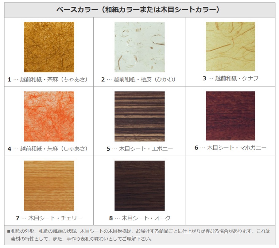 また、和紙の外形、和紙の繊維の状態、木目シートの木目模様などについても、お届けする商品ごとに仕上がりが異なる場合があります。これは素材の特性として、また、手作り表札の味わいとしてご理解下さい。
