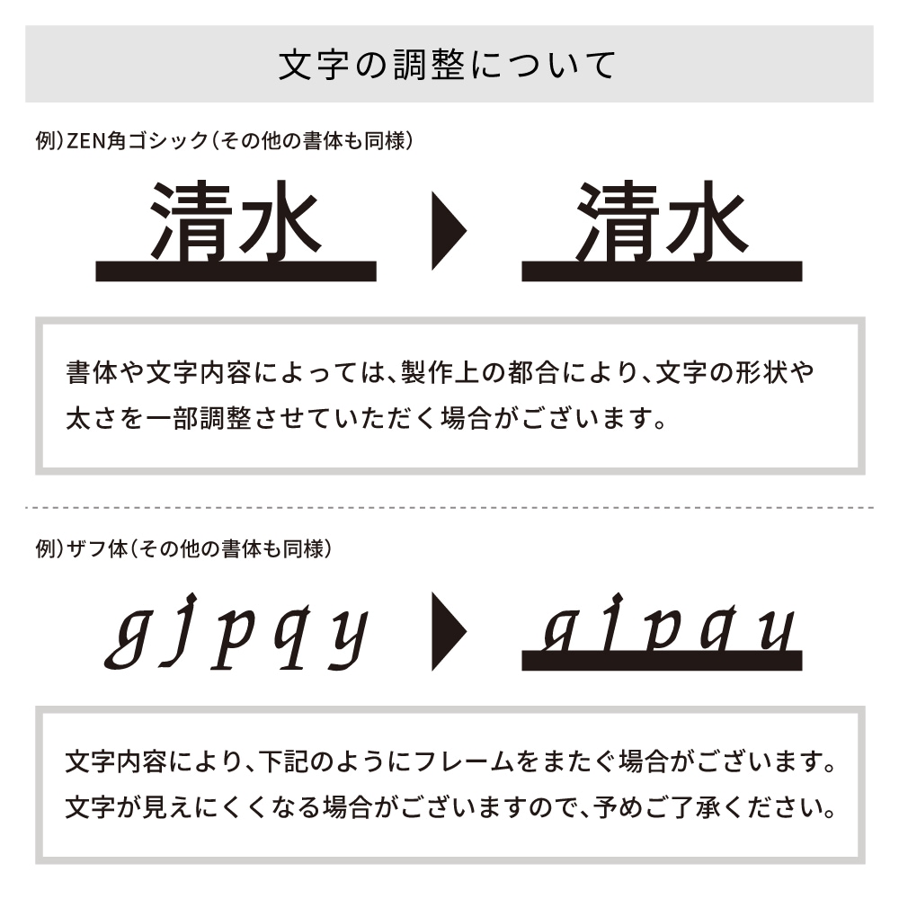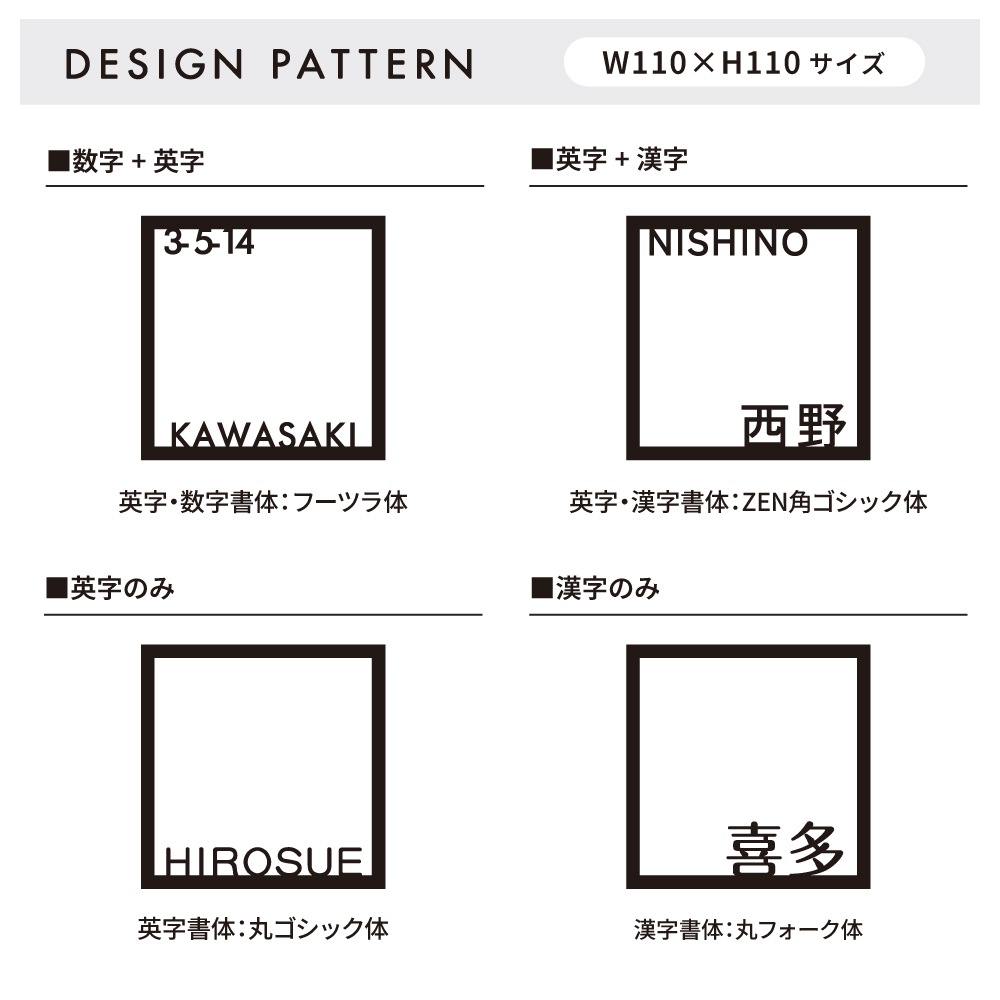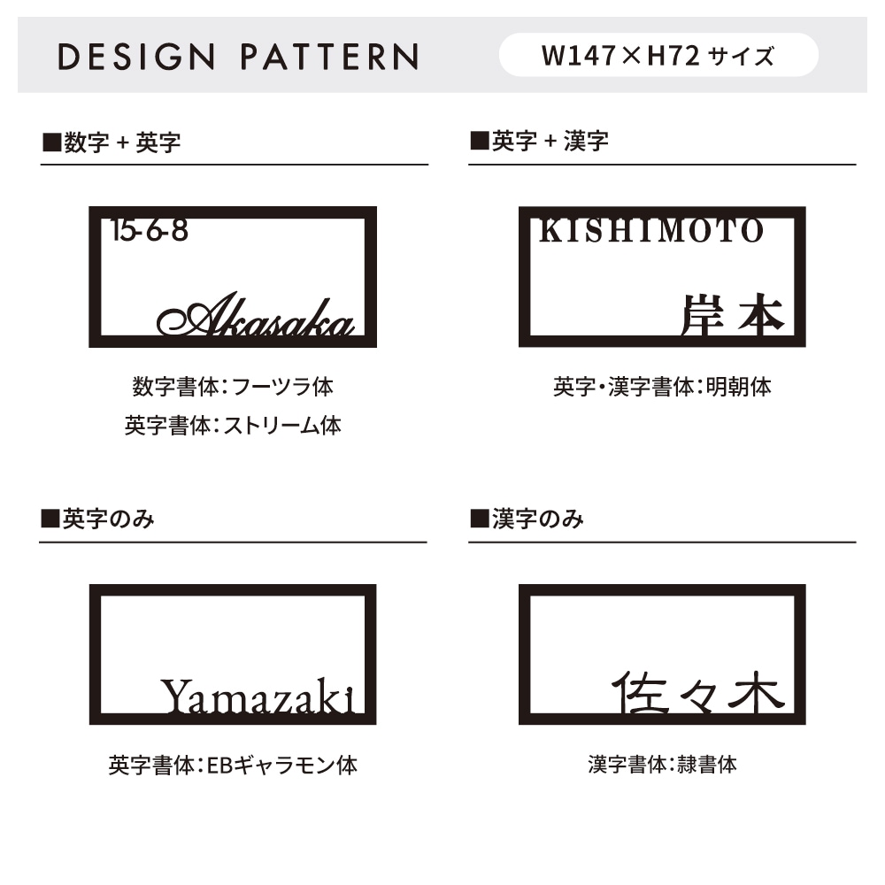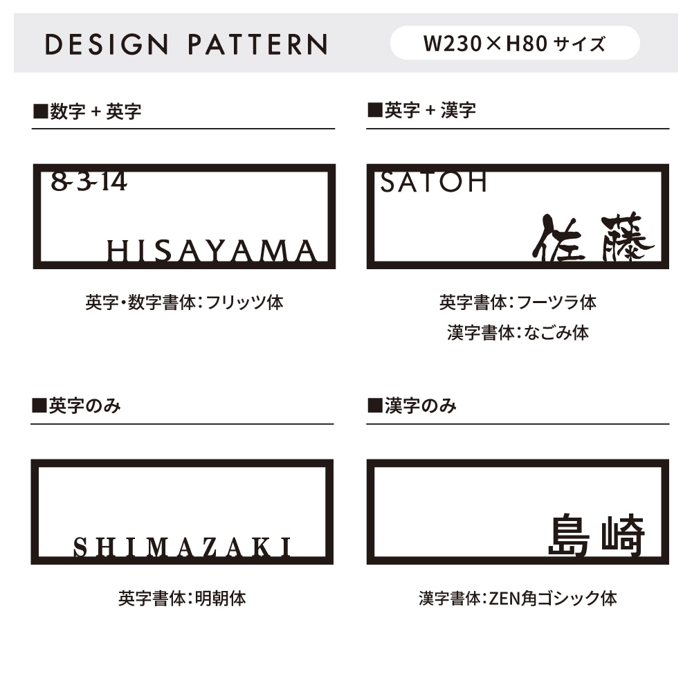 表札の表記内容をご入力下さい。英字のみ漢字のみも可能です。英字は大文字・小文字がそのまま反映されます。
