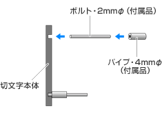 切文字背面の穴に、ボルト(付属品)を取り付け、さらにボルトにパイプ(付属品)を通します。