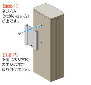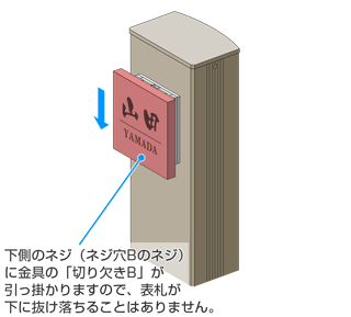【補足】門柱側の上側のネジ(ネジ穴Aのネジ)に、表札側の金具の「切り欠きA」が引っ掛かりますので、表札が上にすり抜けることはありません。