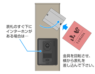 【アドバイス】表札のすぐ下にインターホンがある場合は、表札を真下から差し込むことができません。そのような場合は、門柱側の金具を回転させ、横方向から表札を差し込んで下さい。